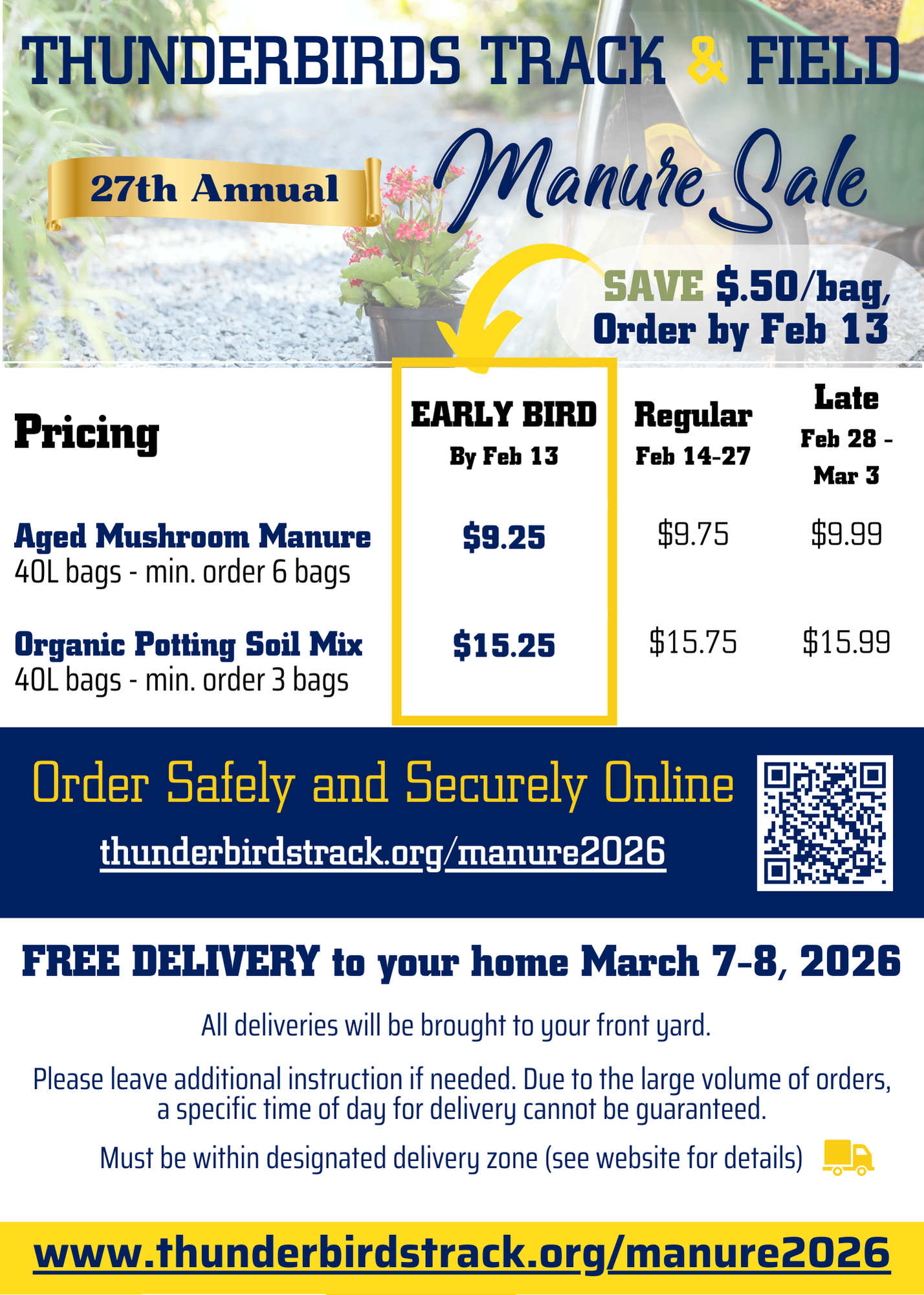 The 27th Annual Vancouver Thunderbirds Manure & Soil Sale directly supports our 500+ athletes from Junior Development - Masters age groups. Established in 1999, Vancouver Thunderbirds is a non profit organization which aims to provide accessible and affordable club membership for all. We believe in the importance of physical literacy, and a fit-for-life attitude!
